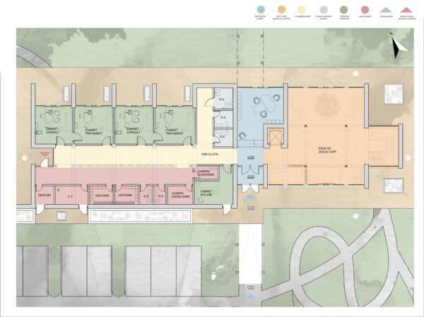 Proiect dispensar medical uman în mediul rural, cu 2 cabinete de consultație, 2 săli de tratament, 1 cabinet de izolare și zonă de joacă pentru copii (2024)