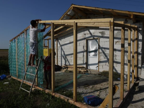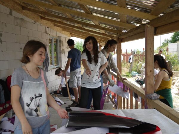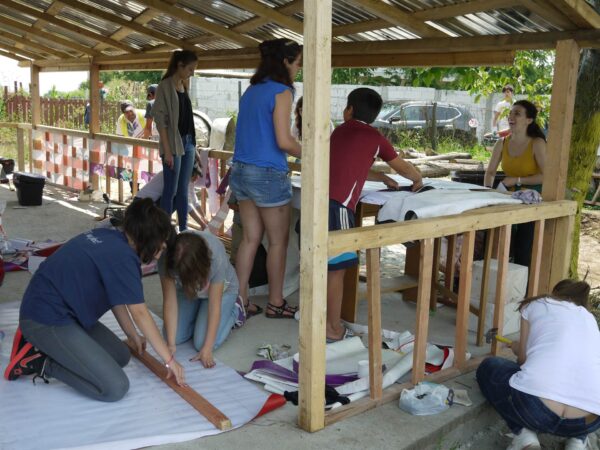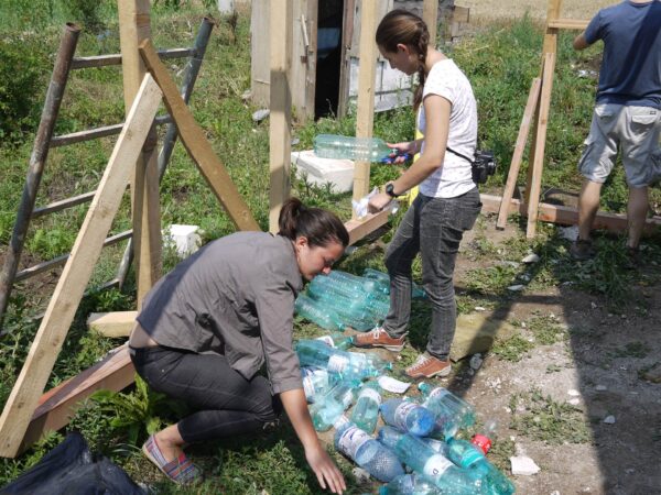Miza activităţilor de construire: refolosirea materialelor reciclabile – bannere cu diferite texturi, sticle şi dopuri de plastic – în realizarea unor inovaţii gândite de studenţi – o pardoseală-mozaic, rezolvarea decorativă a prispei printr-o împletitură de bannere după modelul coşurilor de nuiele, parasolare rotative, un perete semitransparent din pet-uri suprapuse şi un sistem de ventilare bazat pe diferenţa de temperatură, crearea unei faţade ventilate cu panouri glisante.