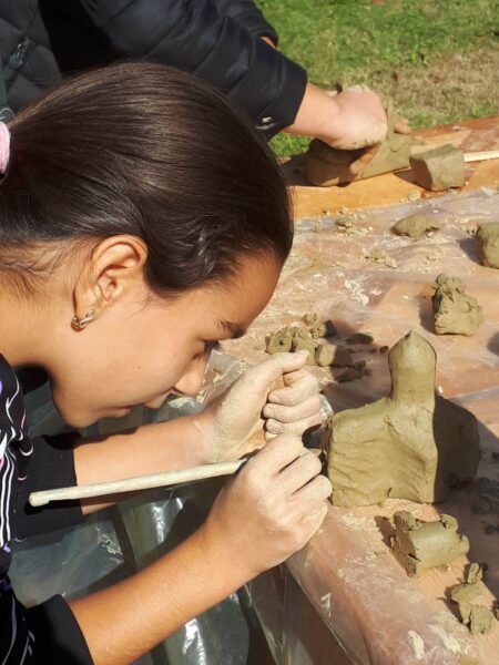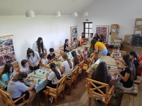 Diminețile Școlii de Vară le-am petrecut alături de elevii din sat, pe care i-am inițiat în prepararea lutului, prin explicații aplicate legate de extracție, cernere, prelucrare, umidificare, frământare și apoi creație! Fiecare și-a alcătuit propriul obiect modelat, prin atenta îndrumare a studenților participanți și a lui Gregorio, meșterul de la Din Lut Românesc. Elevii au fost foarte încântați de posibilitățile (aproape) infinite ale modelajului, și au creat diverse modele – de la pisici, boluri, până la case! În final, s-a modelat întregul sat Chiojdu, fiecare participant sculptându-și propria construcție!