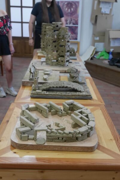 Legat de atelierele de modelaj, pământul găsit în drumețiile transectuale a fost cernut și lăsat la uscat, în cazul în care era umed, iar apoi a fost amestecat cu apă în proporția necesară și frământat pentru a fi bun de lucrat. După ce acest proces a fost terminat, studenții au lucrat prin tehnica ancestrală a cordonului din lut pentru a-și realiza câteva creații inițiale, iar apoi au explorat materialitatea argilei prin excizie și incizie. Fiecare participant (inclusiv colegii conectați online) s-au bucurat de rezultatele obținute! În următoarele zile ale Școlii de Vară, studenții și-au elaborat prototipuri ceramice, schițate la nivel de idee, pe care le-au aplicat apoi în machete – au gândit și construit module arhitecturale, care apoi au generat diferite proiecte care îmbină meșteșugul cu inovația în design. În ultima zi a Școlii de Vară, amfiteatrul s-a umplut treptat de structuri creative ce au crescut de la câteva mici module la adevărate turnuri! Studenții au susținut prezentări despre obiectele arhitecturale pe care le-au creat în timpul Școlii, vorbind despre concept, evoluția proiectului și rezultatul final.